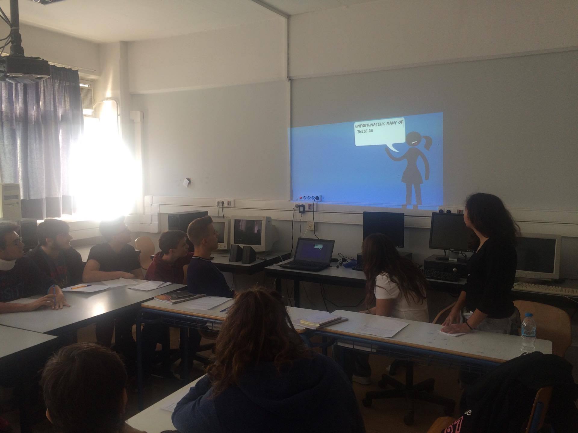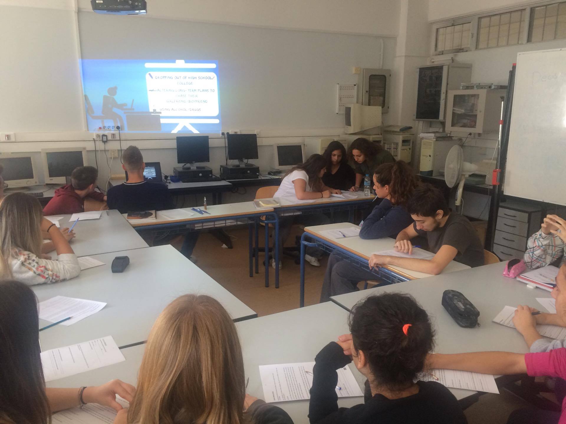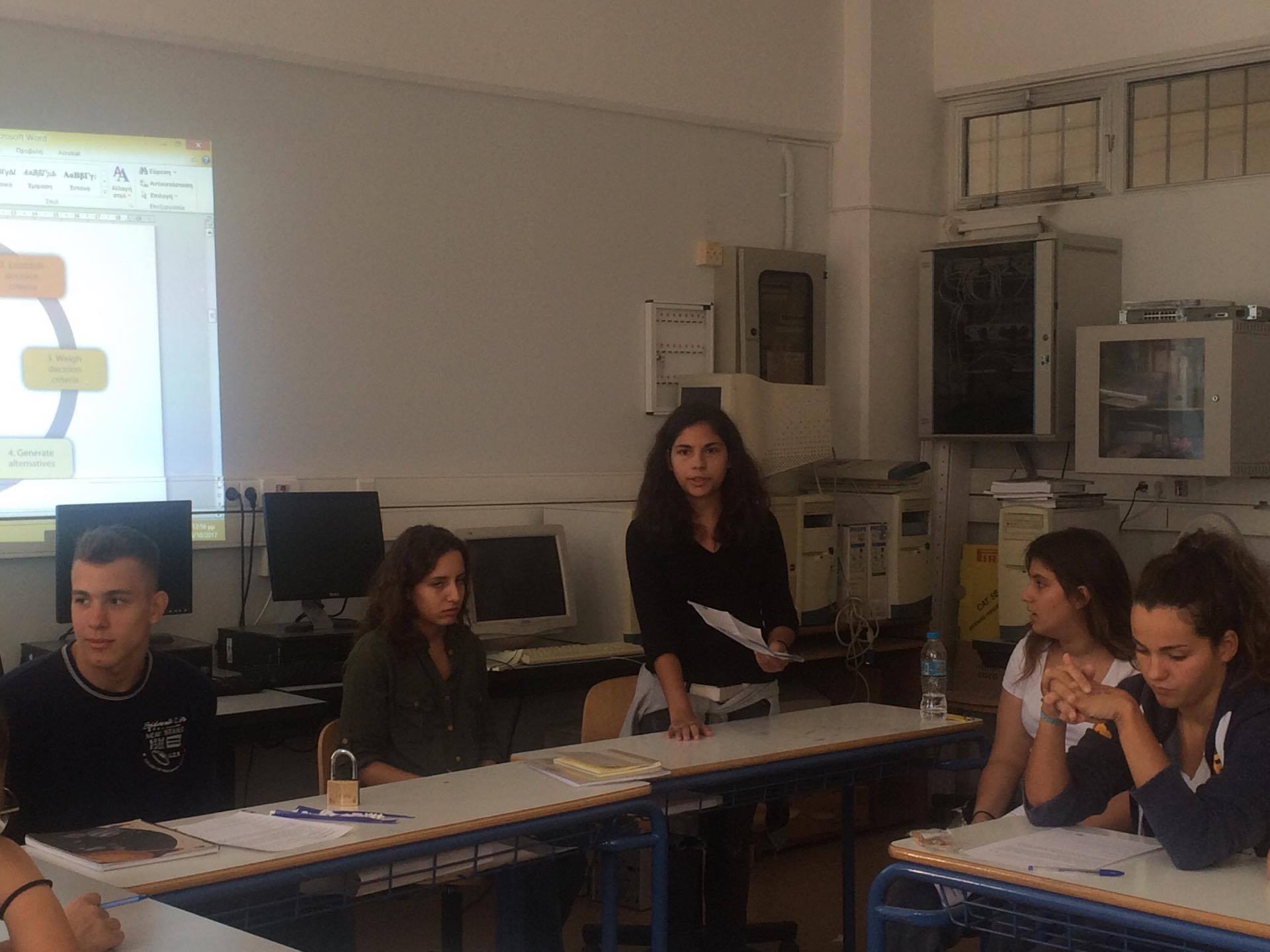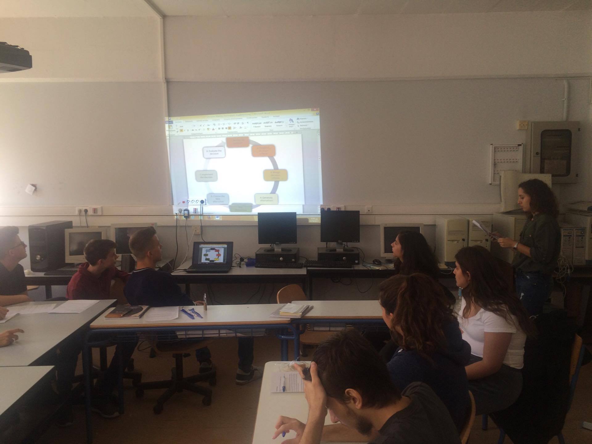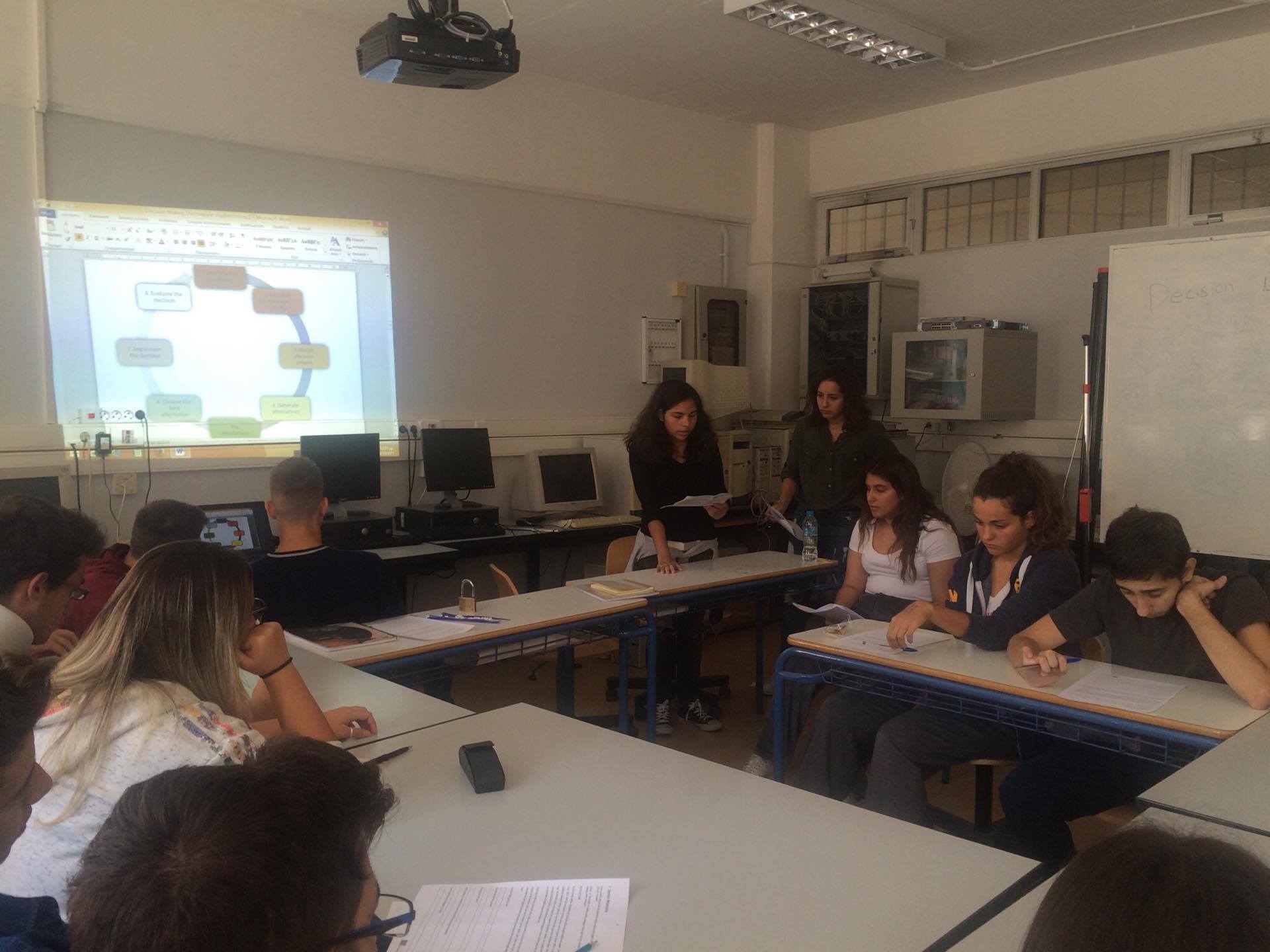 Στο πλαίσιο του προγράμματος Erasmus+ KA219, οι μαθήτριες Θάλεια Καλογεροπούλου (Β1), Βίβιαν Πηλάκη (Β3) και Νεφέλη Σκεπετζάκη (Γ4) δίδαξαν την ενότητα Decision Making στους μαθητές του τμήματος Β1.Οι στόχοι του μαθήματος ήταν να περιγράψουν τη φύση των αποφάσεων κατά την εφηβική ηλικία, να καθορίσουν τον ορισμό του Decision Making, να συνειδητοποιήσουν τις προϋποθέσεις που οδηγούν σε σωστές αποφάσεις, να καθορίσουν ένα ολοκληρωμένο μοντέλο διαδικασίας και να βοηθήσουν τους μαθητές ώστε να βελτιώσουν την ποιότητα των εκάστοτε αποφάσεών τους.