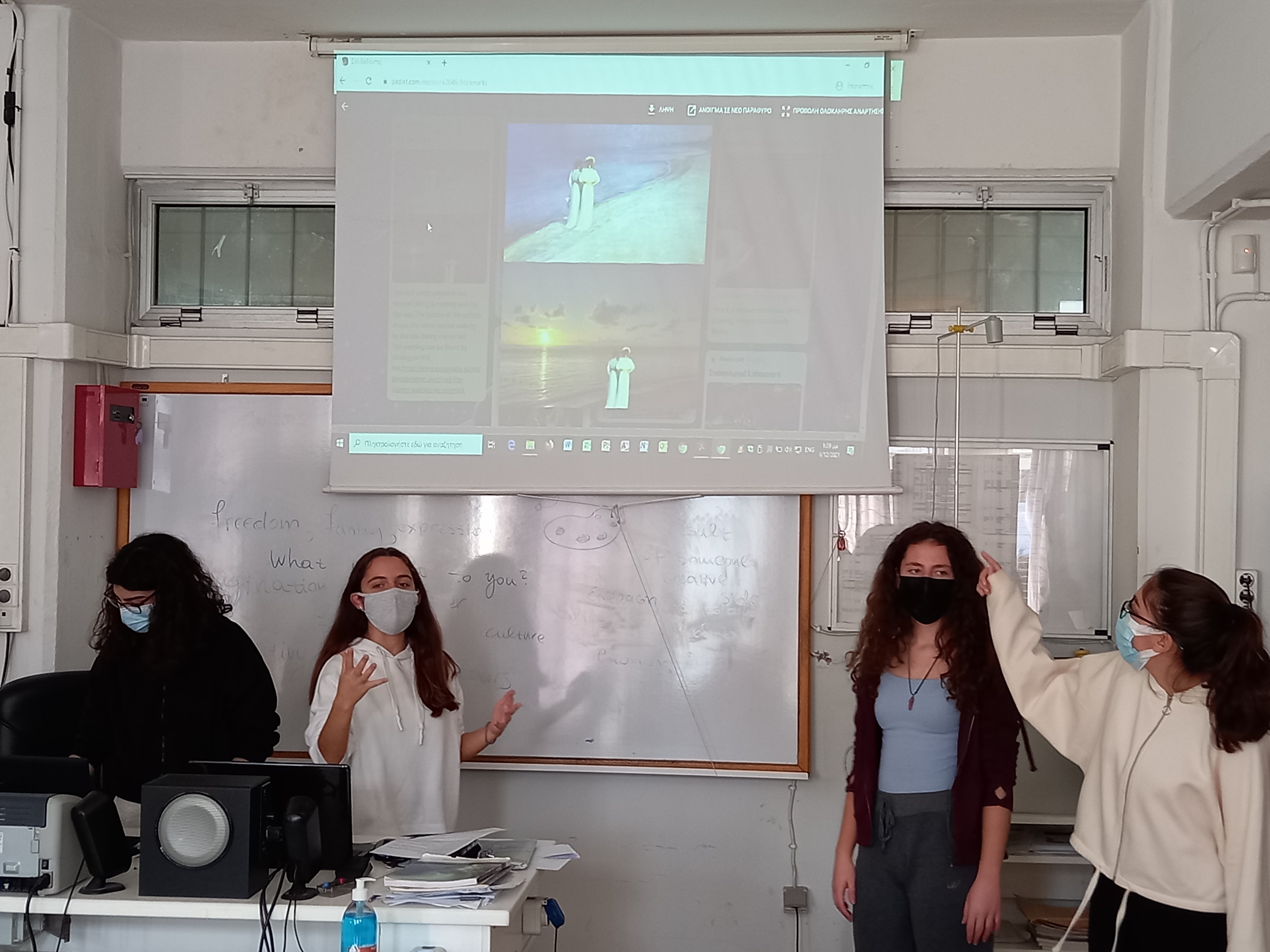 5 μαθήτριες του τμήματος Β3 δίδαξαν στους συμμαθητές τους τη δραστηριότητα Refake it! στο μάθημα της Πληροφορικής. Aφού ενημέρωσαν τους συμμαθητές τους για την πλατφόρμα της Europeana, το περιεχόμενο της δραστηριότητας και έδωσαν τις κατάλληλες οδηγίες, ανέθεσαν στους συμαθητές τους να επιλέξουν μια φωτογραφία/ έναν πίνακα από την πλατφόρμα Europeana για να την διαμορφώσουν εκ νέου στη σύγχρονη εποχή και μετά να την αναρτήσουν στο padlet του μαθήματος.