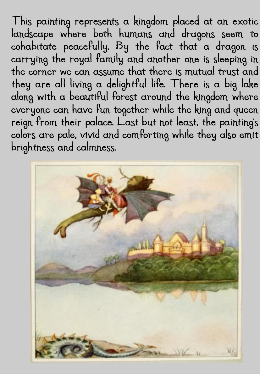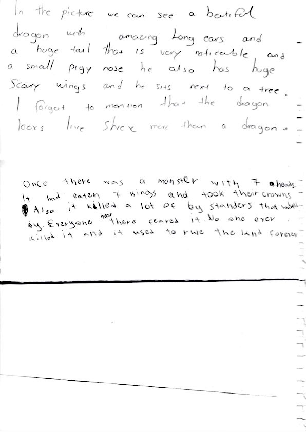 Στη δραστηριότητα αυτή προβλέπεται οι μαθητές/τριες σε ομάδες των τριών να αναλάβουν τους εξής ρόλους. Ένας/μία βλέπει μια εικόνα δράκου από τη συλλογή της Europeana που έχει προεπιλέξει και βλέπει μόνο αυτός, την οποία στη συνέχεια περιγράφει προφορικά στα αγγλικά στα υπόλοιπα μέλη της ομάδας του. Ένας/μία από τα δύο άλλα μέλη ζωγραφίζει με βάση την προφορική περιγραφή αυτού που παρουσιάζει την εικόνα και ο άλλος/η άλλη καταγράφει σε κείμενο στα αγγλικά την περιγραφή του απεικονιζόμενου δράκου με βάση την προφορική παρουσίαση.