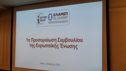Η προσομοίωση αφορούσε τις εργασίες της κοινής συνεδρίασης του Συμβουλίου Εσωτερικών και Εξωτερικών Υποθέσεων της ΕΕ με θέμα τη Μετανάστευση και διοργανώθηκε από το Ευρωπαϊκό Κέντρο Πληροφόρησης Europe Direct Eliamep Athens με συντονίστρια την κα. Μαριάννα Βασιλοπούλου. Στην προσομοίωση συμμετείχαν μαθητές (σύνολο 56) και συνοδοί καθηγητές από 22 Λύκεια της Αττικής και ένα Λύκειο από την Τρίπολη. Οι μαθητές εκπροσώπησαν τα κράτη μέλη της ΕΕ από τη θέση του Υπουργού των Εσωτερικών και των Εξωτερικών.